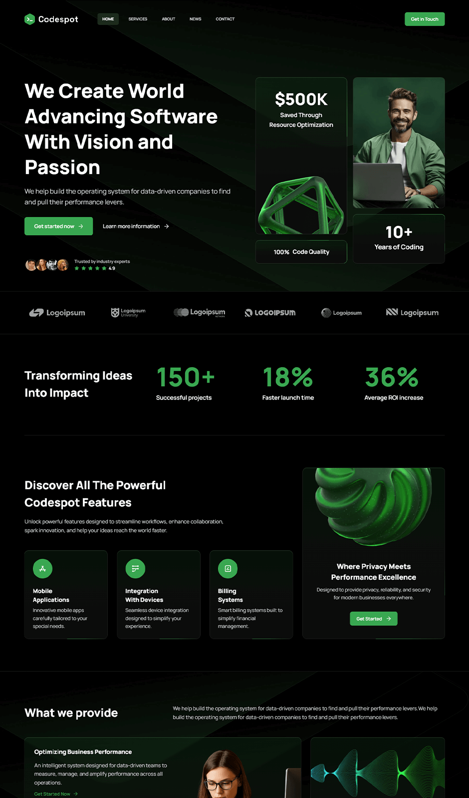 为软件机构和开发者打造的现代深色风格模板,配以霓虹点缀。它包含预制的服务页面、博客以及联系表单。